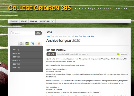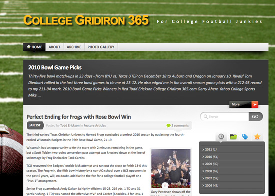 Sports writer Todd Erickson established this site in 2010 as a showcase/blog for his many articles regarding college football. These articles range from individual players to the College Football landscape as a whole. Not only does he have many ongoing editorials, but also offers many unique image galleries relating to various conferences and teams.