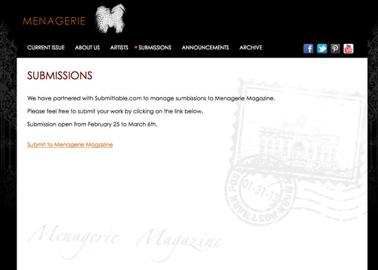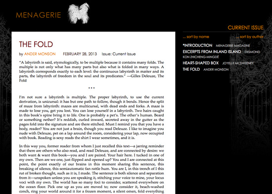 The Menagerie houses, for short periods of time, small, crafted exhibits of text. Each issue is a curated statement — several poems, pieces of prose, and hybrid work that deserve the close attention of a smaller stage.