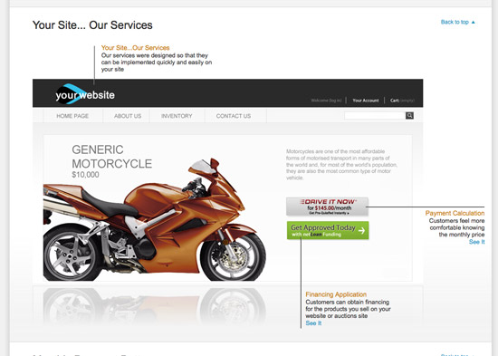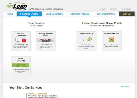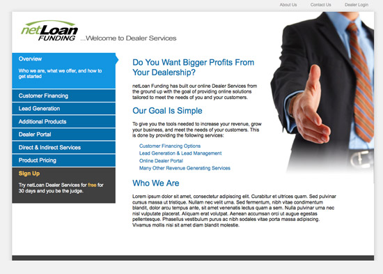 The idea behind the Dealer Services Marketing site is fairly straightforward – it represents an online marketing site that provides potential clients information regarding our new Dealer Services Portal as well as an easy method to enroll.
