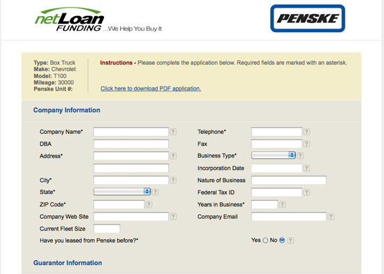 This project required a landing page and credit application that were consistent with the Penske branding, but unique to our client netLoan Funding. In addition to the landing pages, we also designed a back-end system to track the status of credit applications from submittal to approval.
