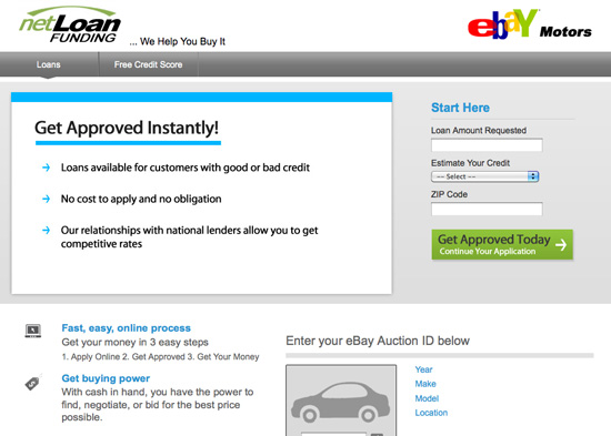 eBay is the world's largest online auction site. Among the many items that are sold on their site are various types of motor vehicles. The netLoan eBay landing pages provide these buyers various financing options before and after they win an auction.